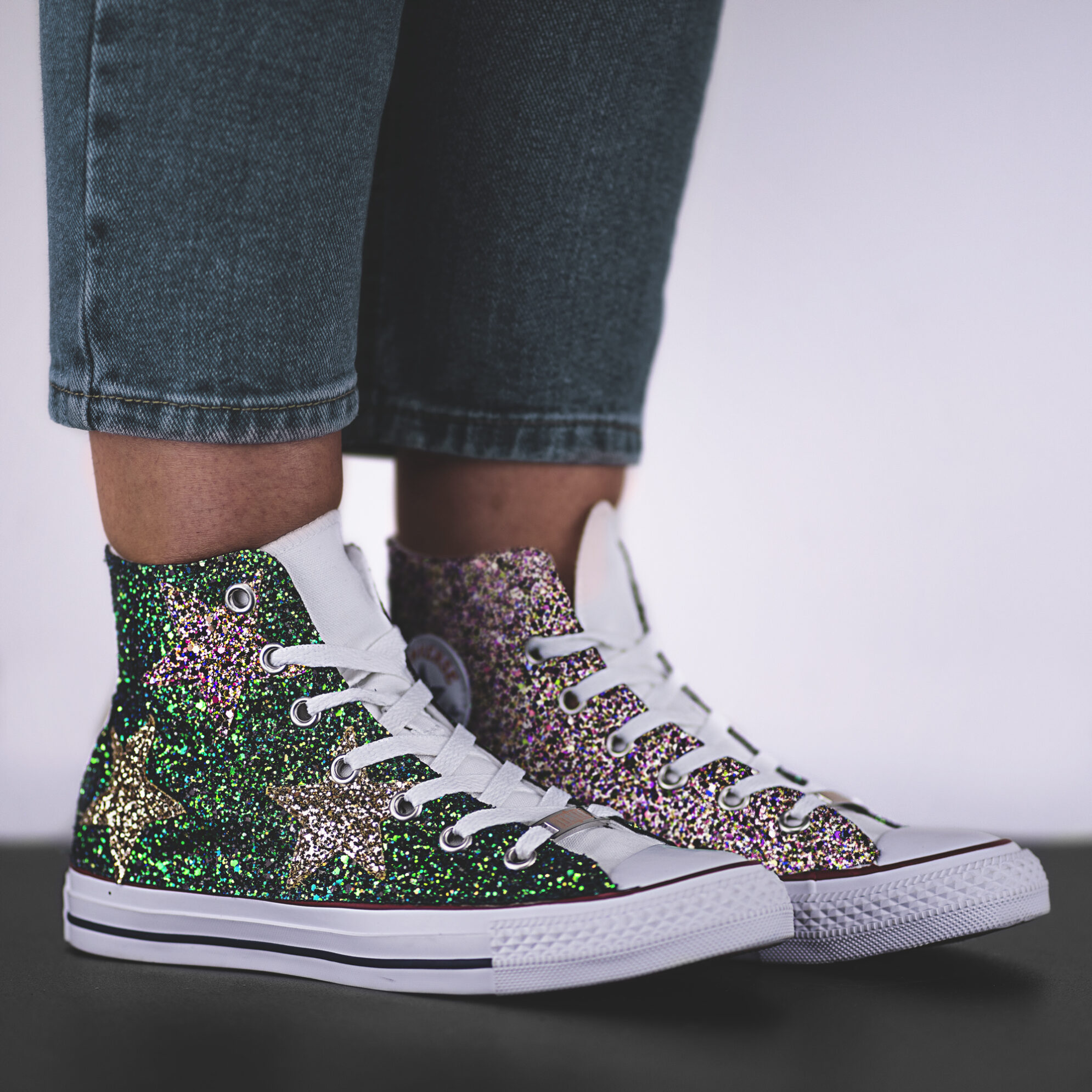 Queste Converse All Star Gloria sono personalizzate con glitter verde aurora, glitter multicolor, glitter oro e borchia stella oro sul tacco.