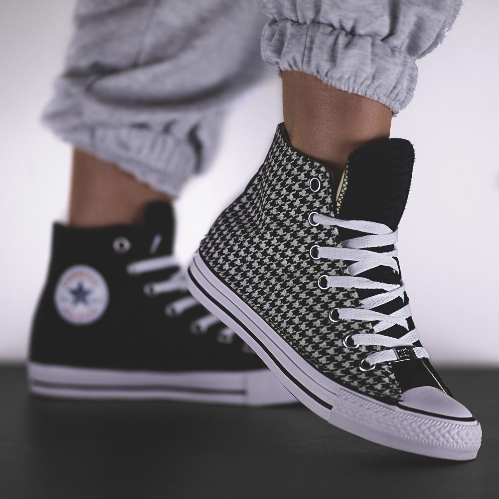 Queste Converse All Star Skin sono personalizzate con tessuto pied de poule sul lato esterno, velluto nero sul lato interno e glitter constellation nero sul tacco!