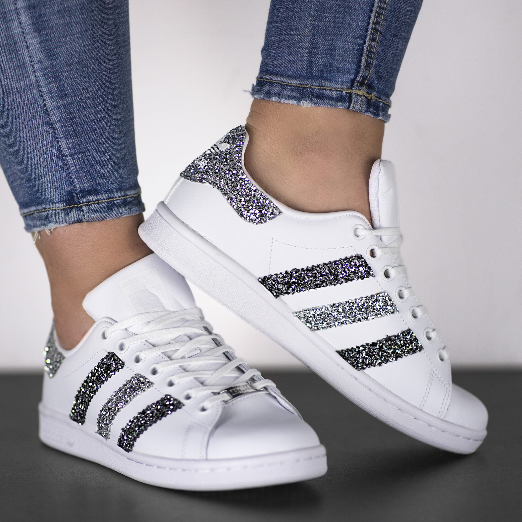 Queste Adidas Stan Smith Best Friend sono personalizzate con glitter argento, glitter argento dark e logo glitter bianco sul tacco!