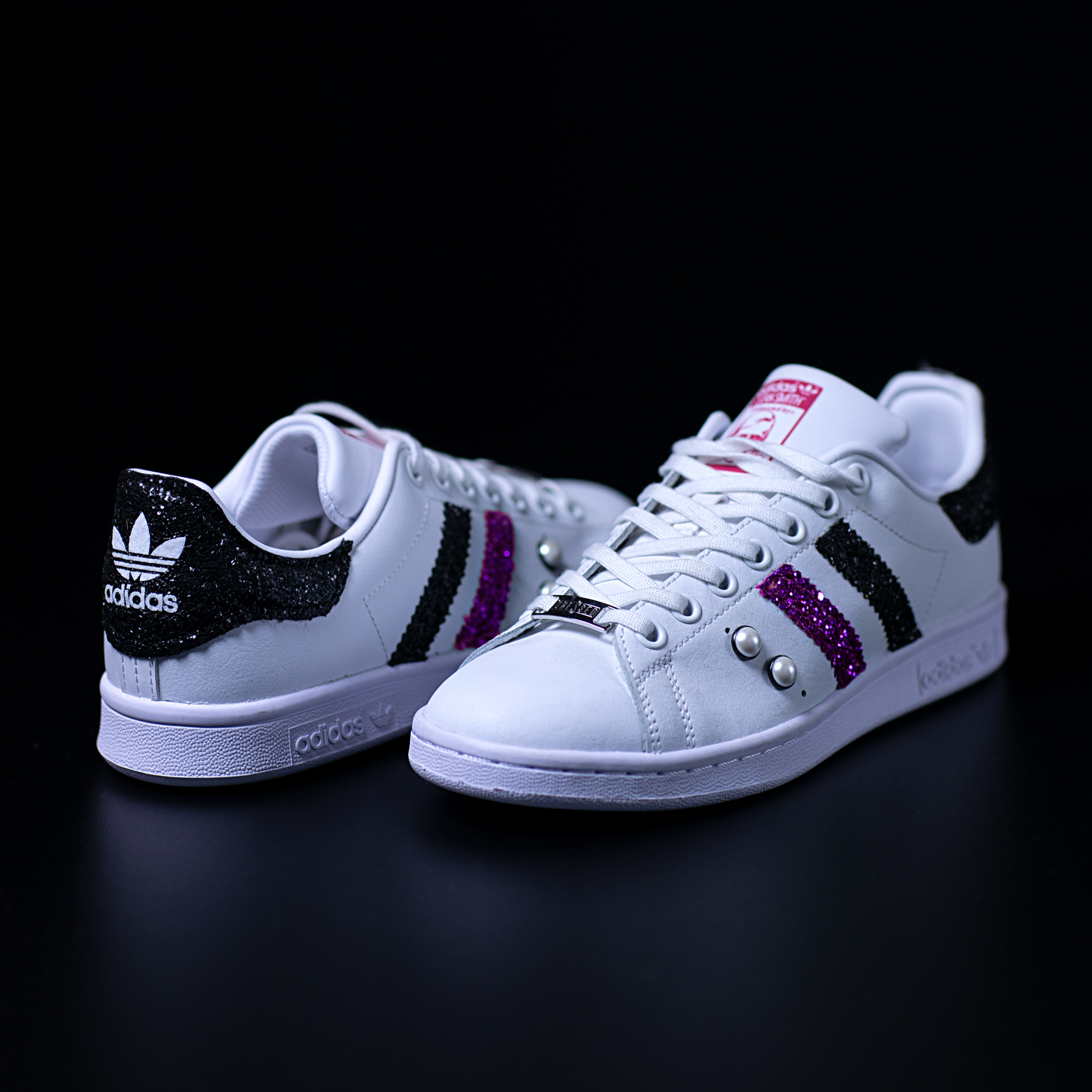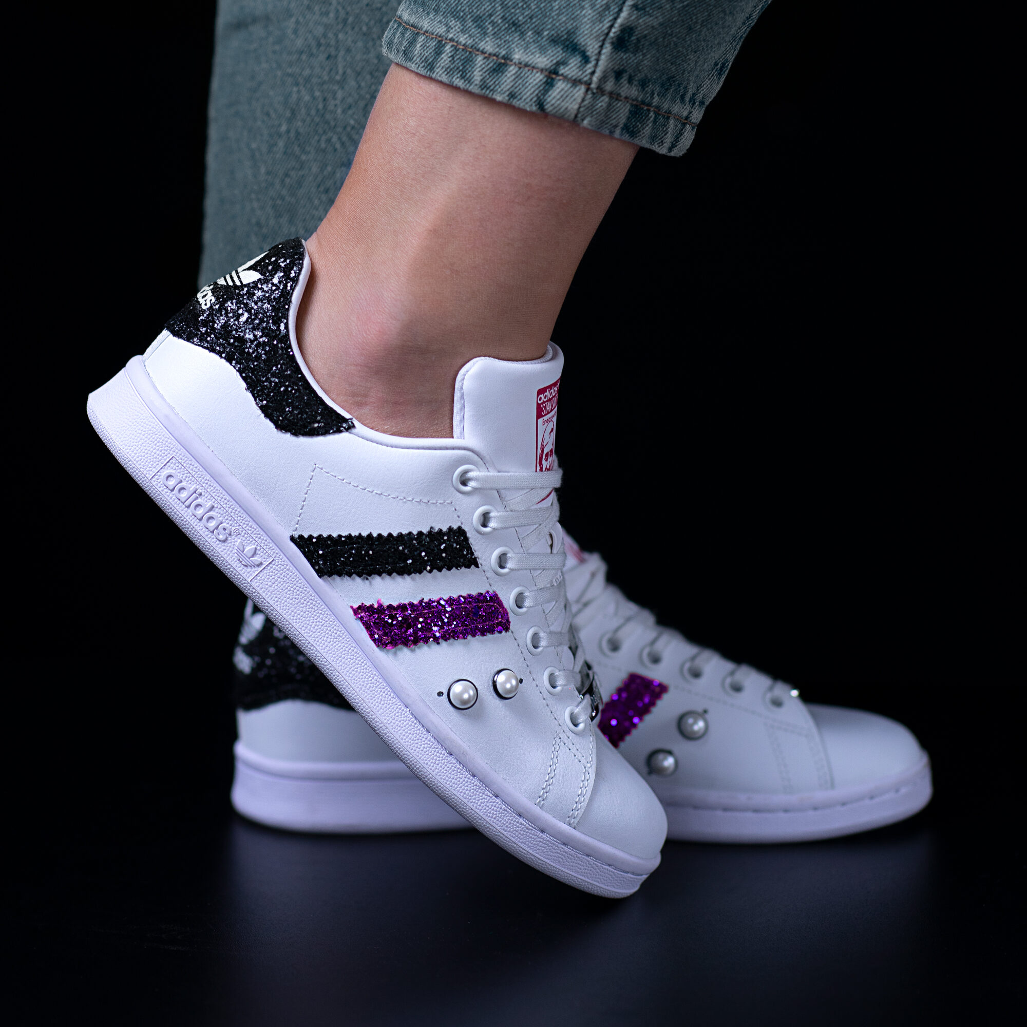Queste Adidas Stan Smith Crawling sono personalizzate con glitter nero, glitter viola, borchie perla e logo glitter bianco sul tacco!