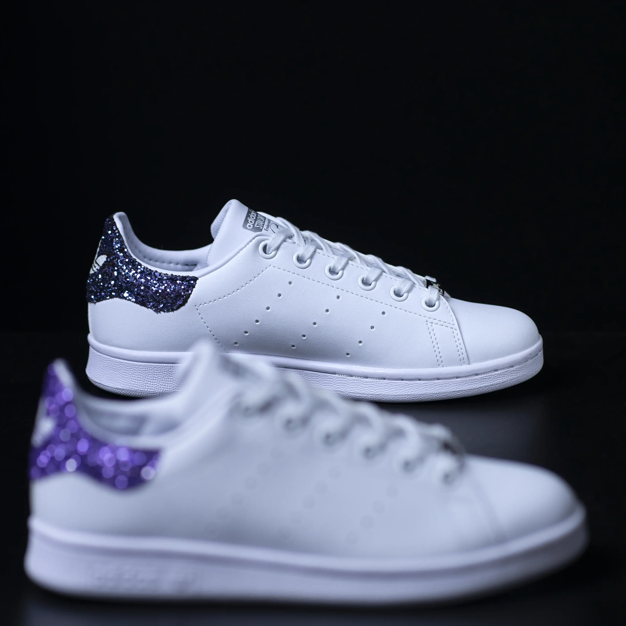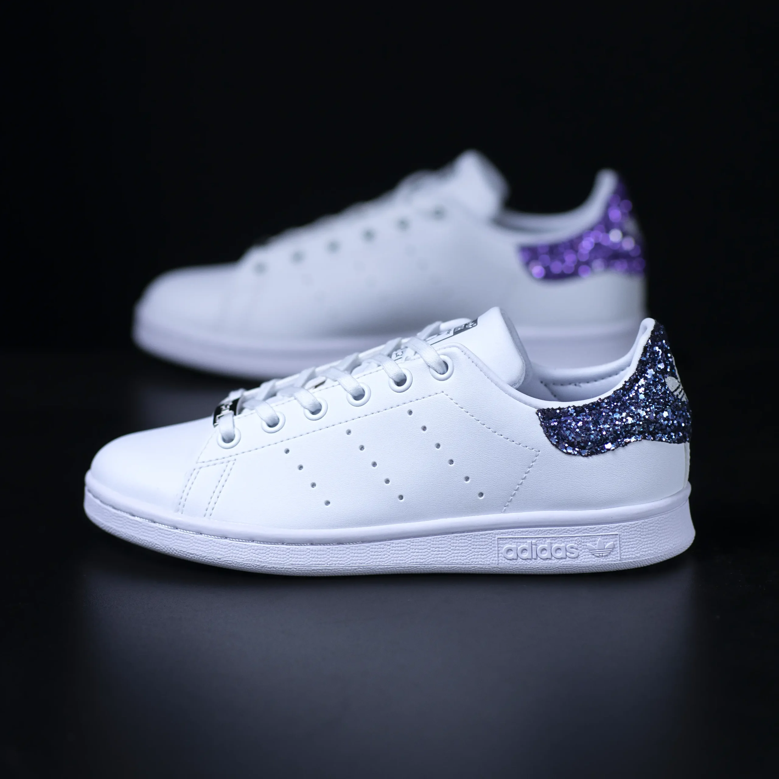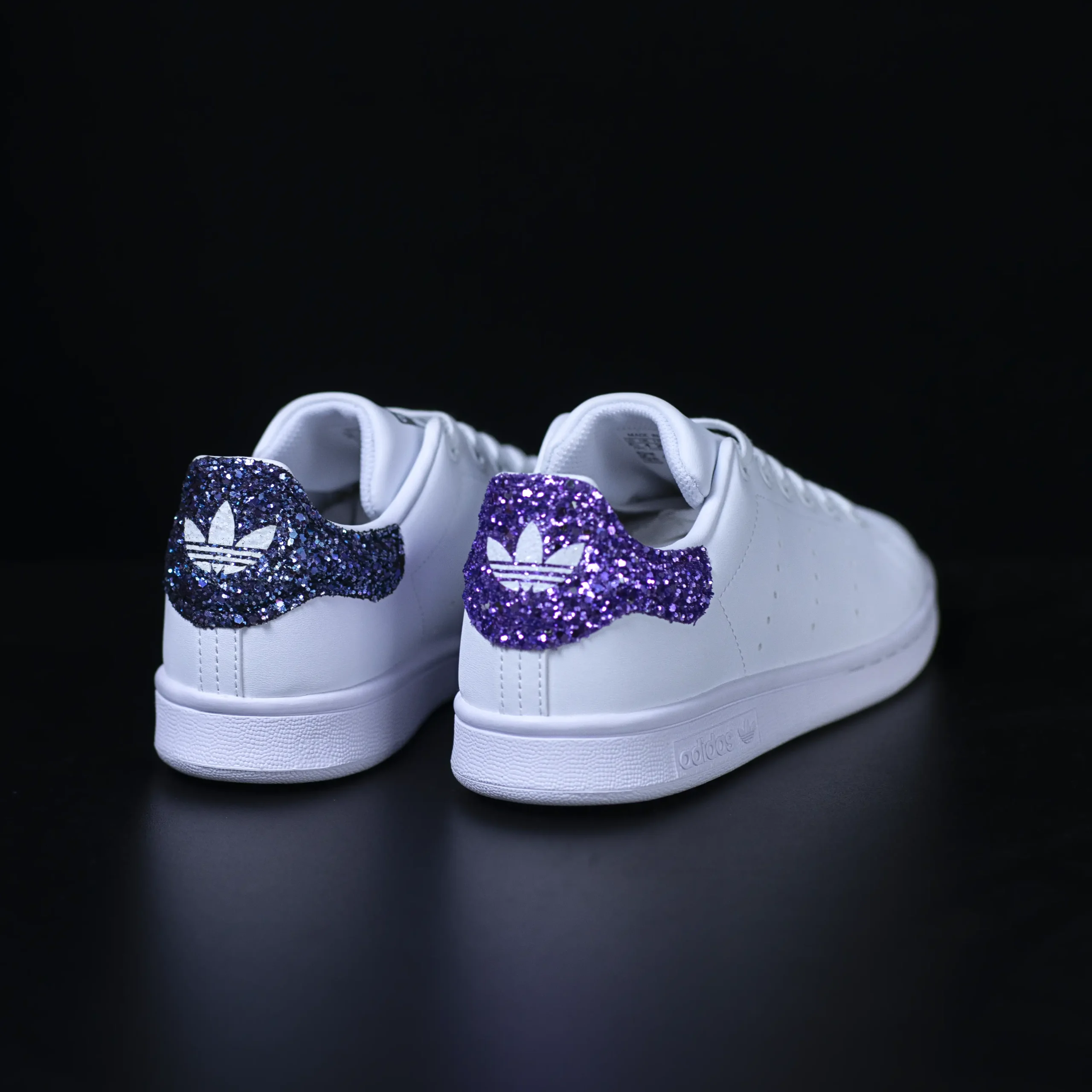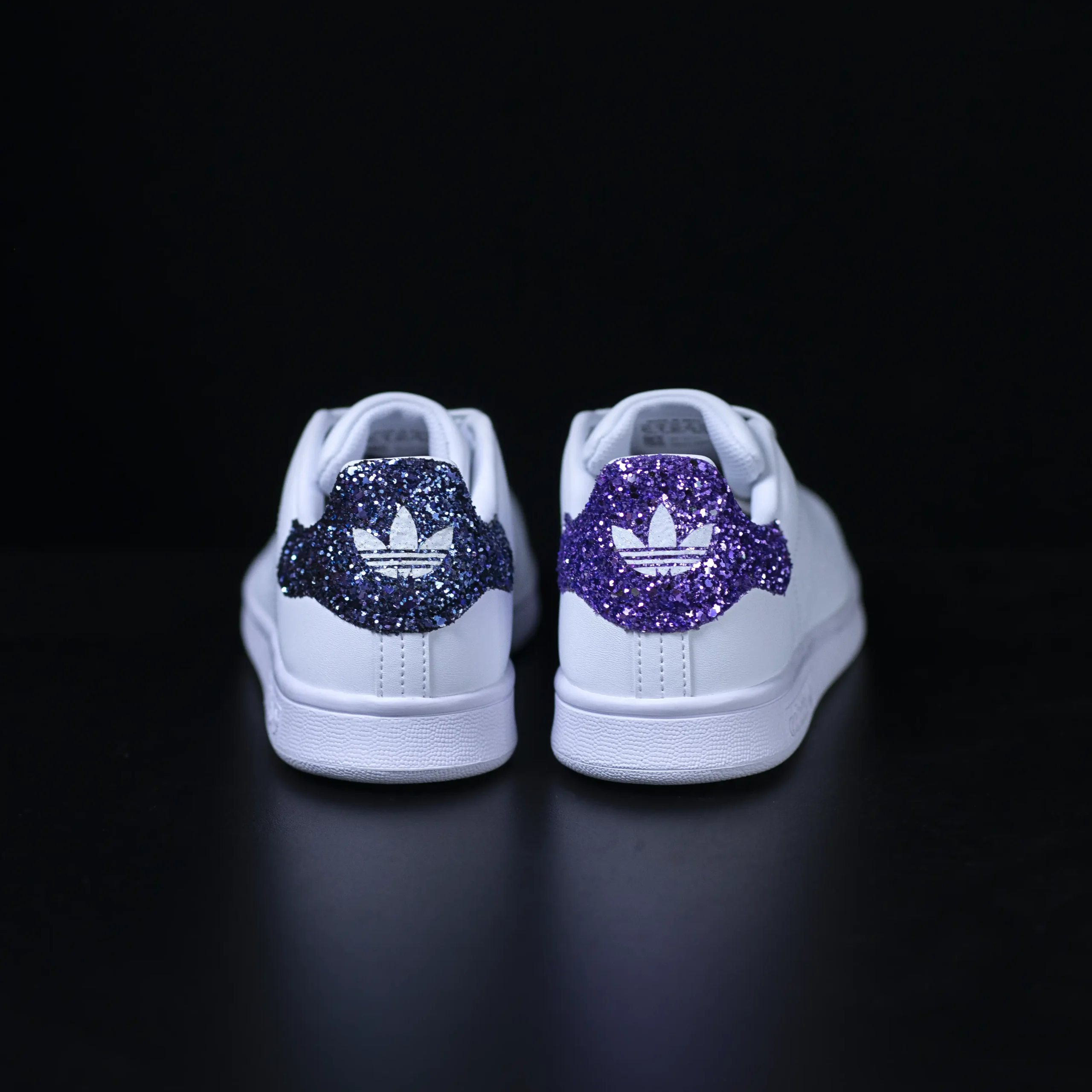 Queste Adidas Stan Smith Riptide sono personalizzate con il tacco destro glitter viola lavanda, il tasto sinistro glitter blu ghiaccio e logo bianco glitter sul tacco.