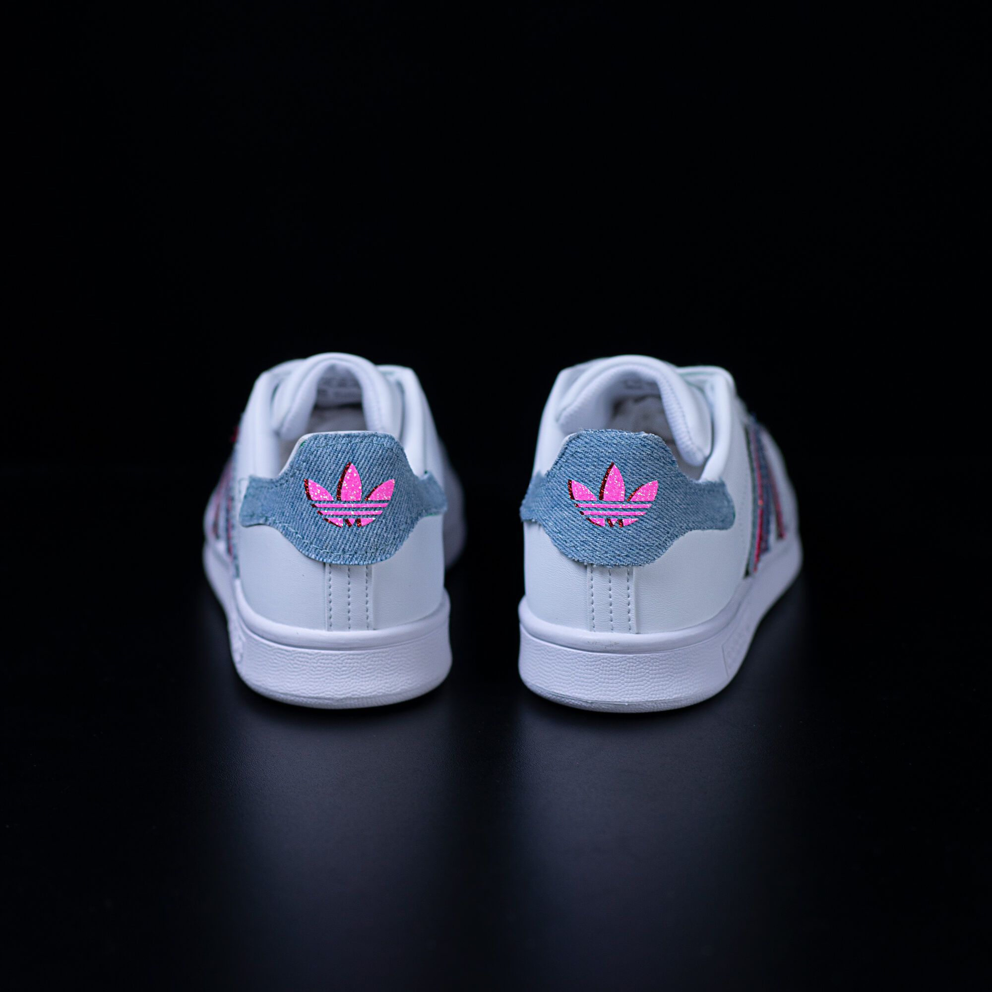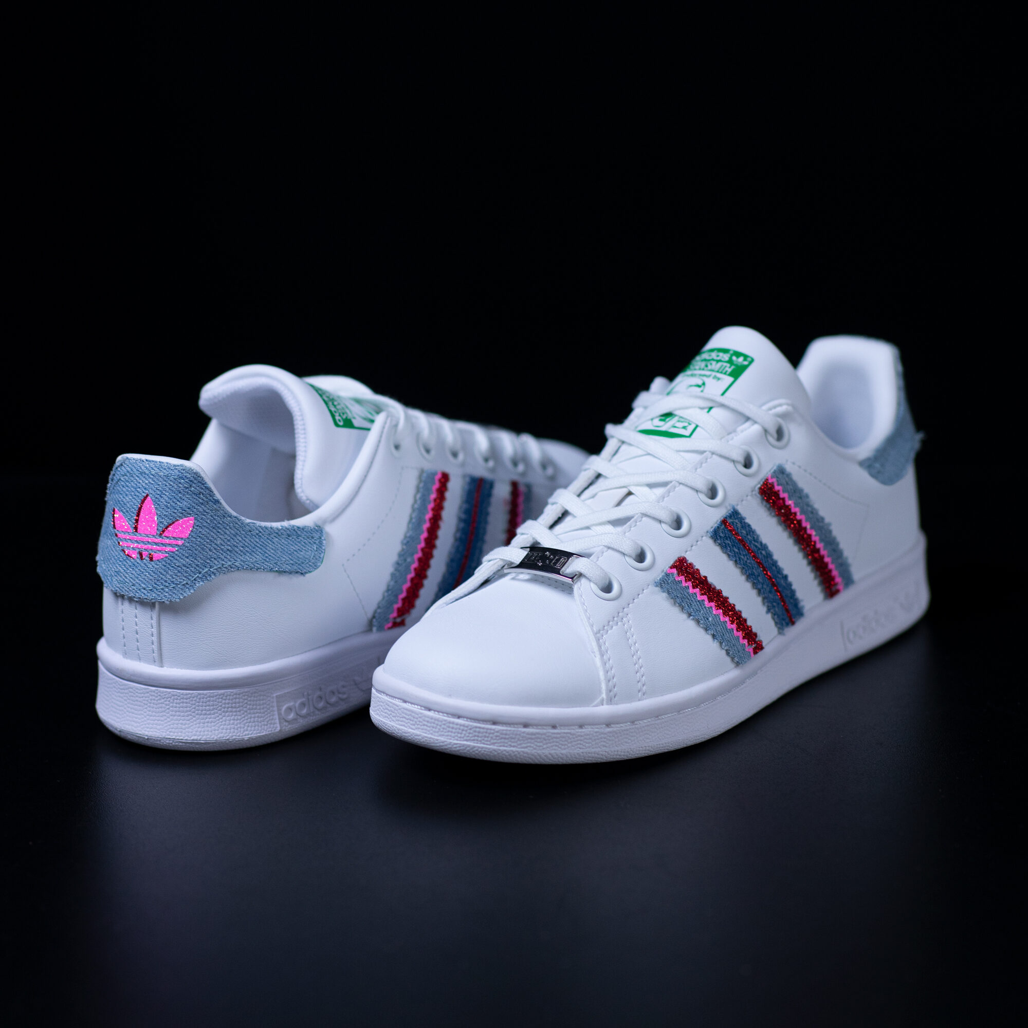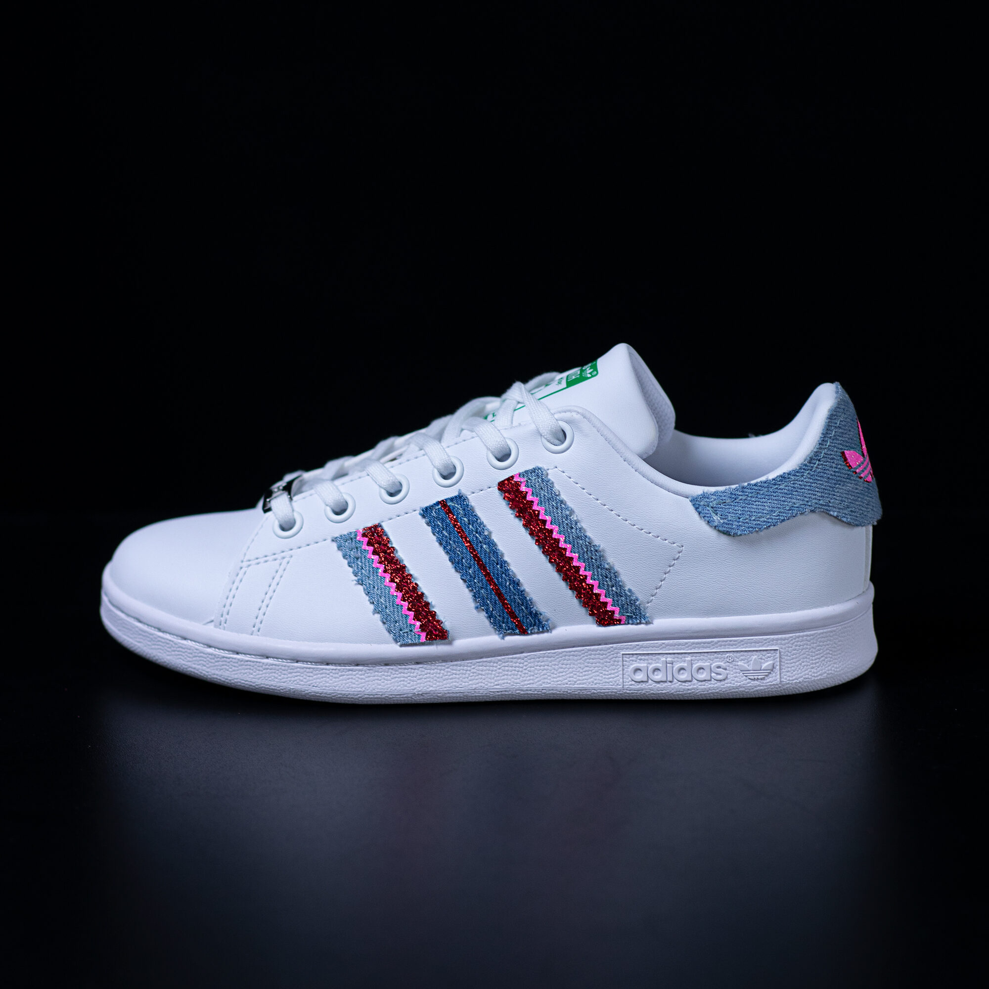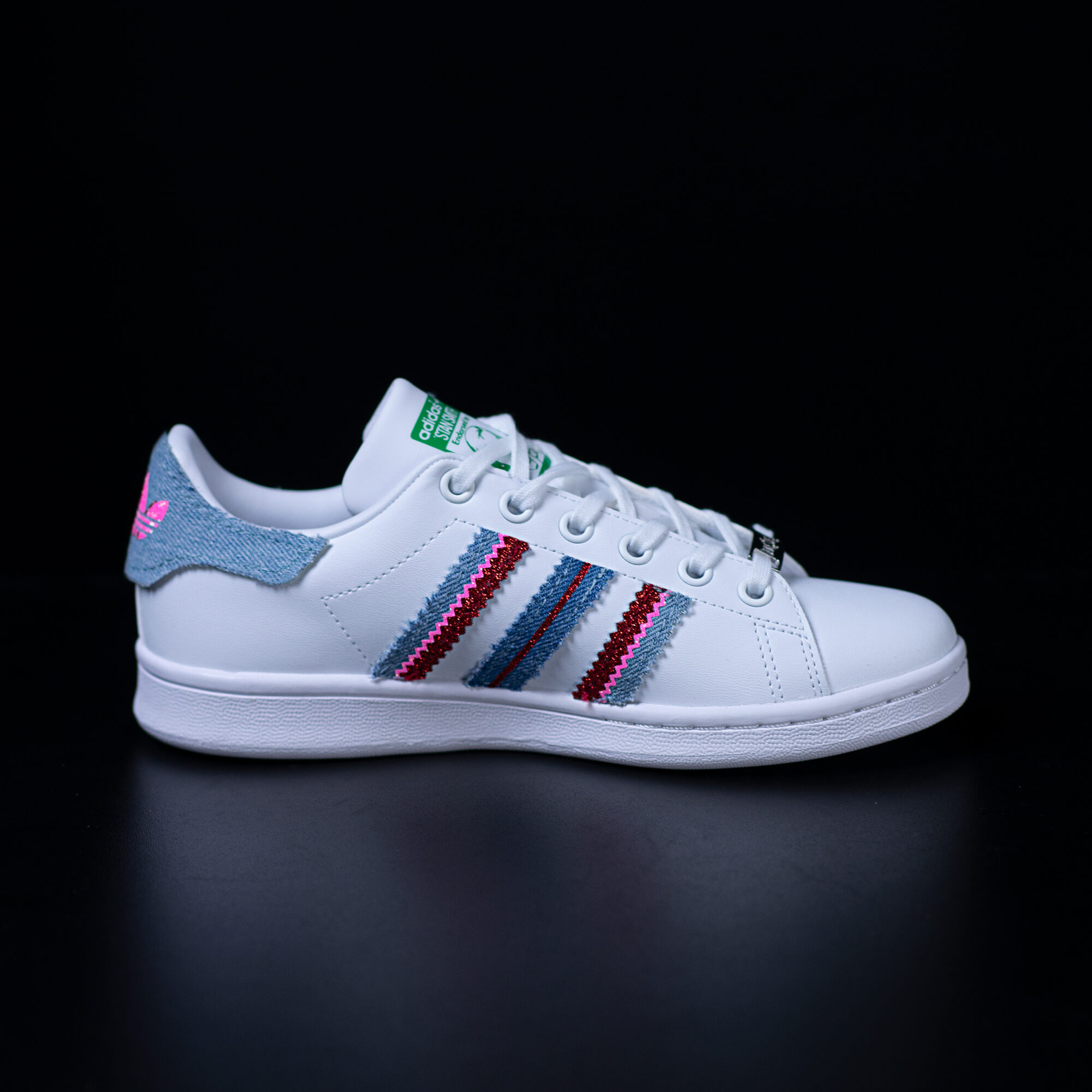 Queste Adidas Stan Smith The Feeling sono personalizzate con jeans, lavorazione speciale tre colori, logo con lavorazione bicolore rosa fluo e rosso sul tacco!