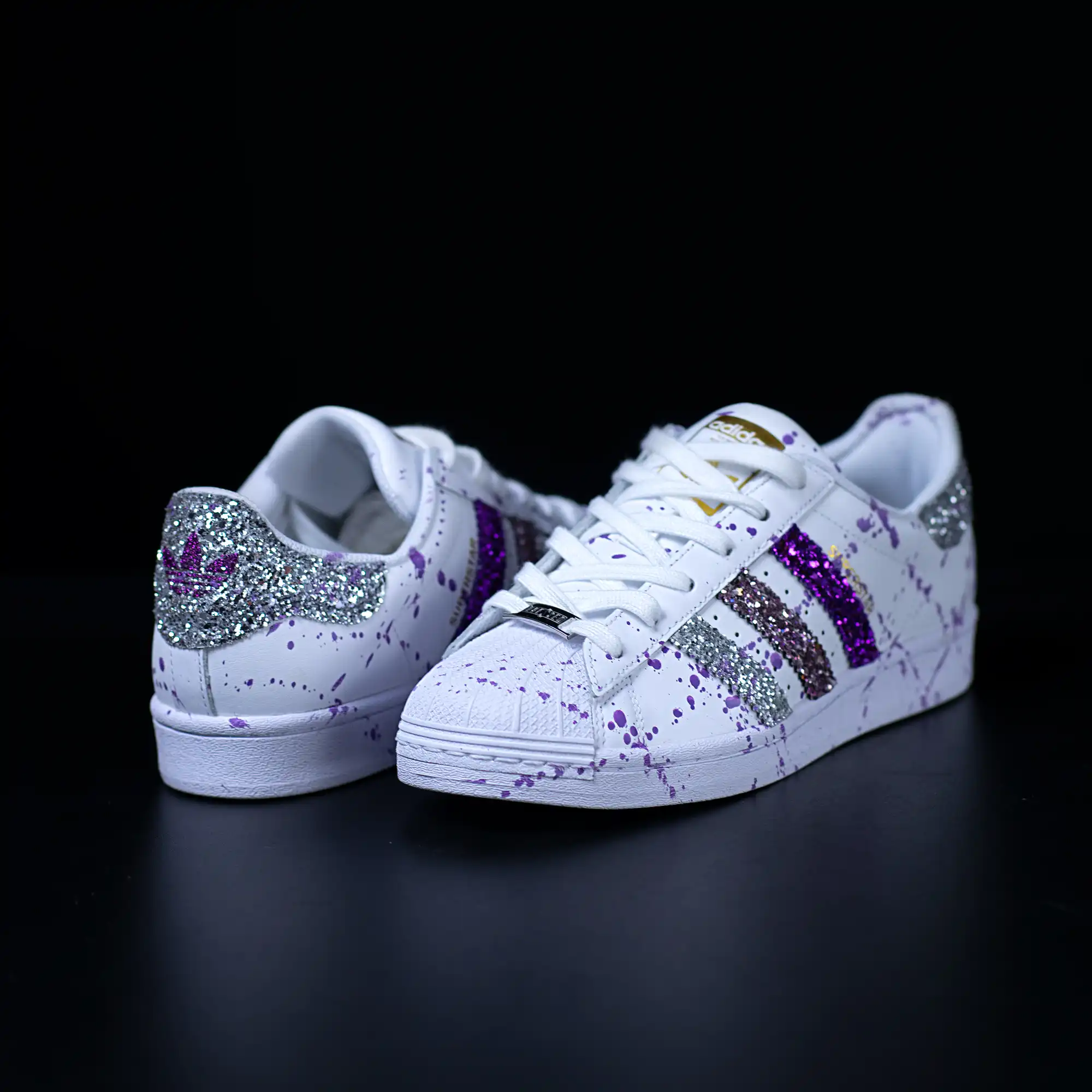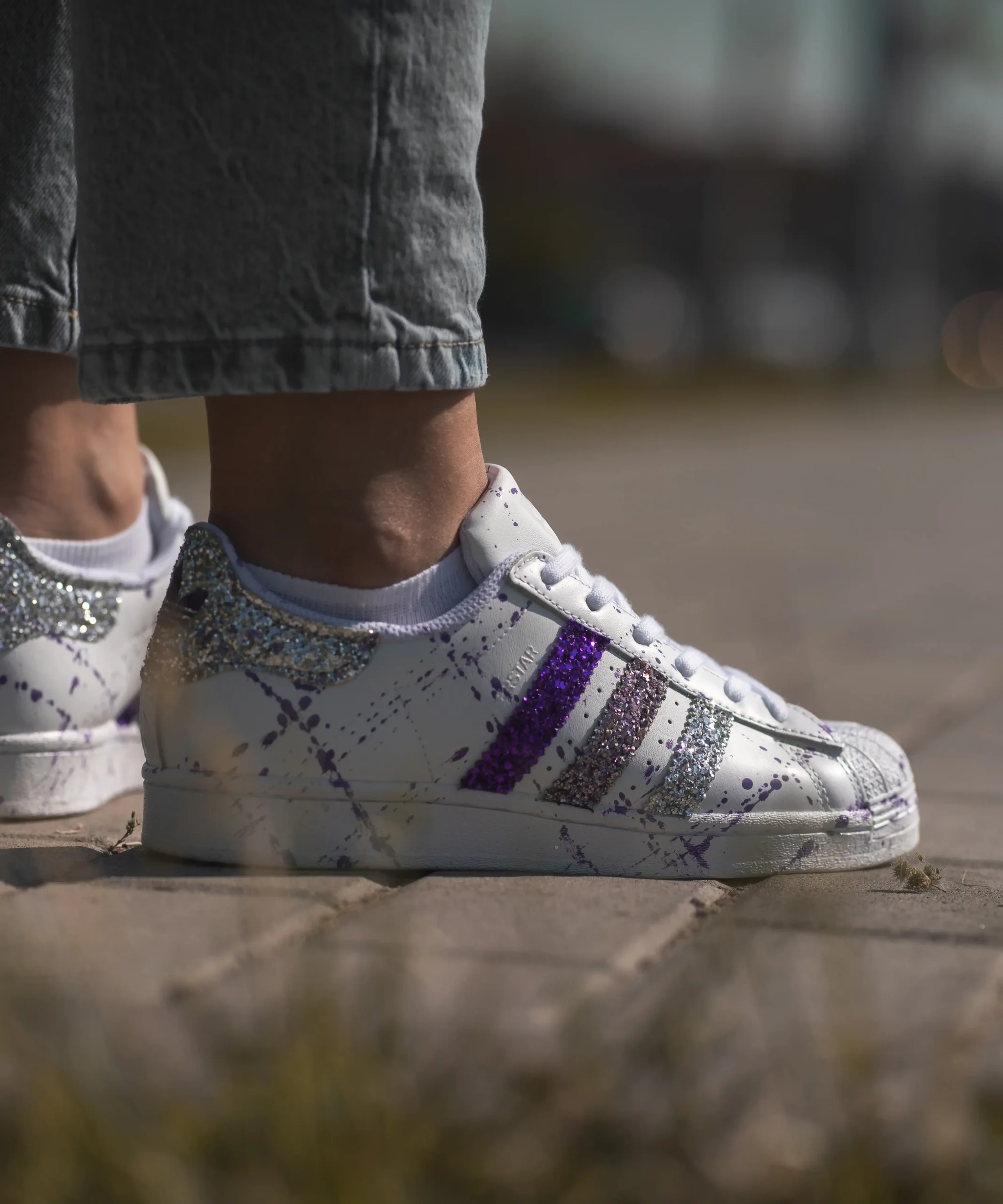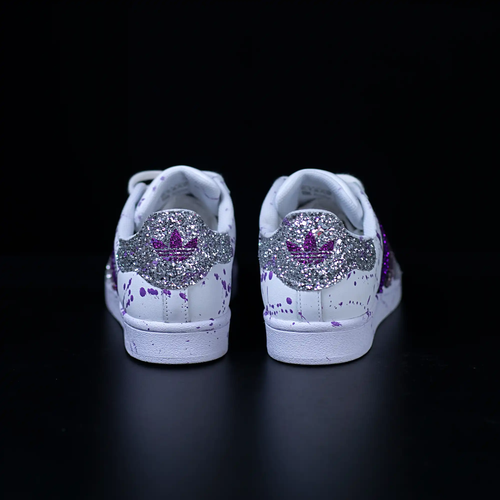Queste Adidas Superstar Control sono personalizzate con glitter argento, viola, rosa antico, sporcatura pollock viola e logo viola sul tacco.