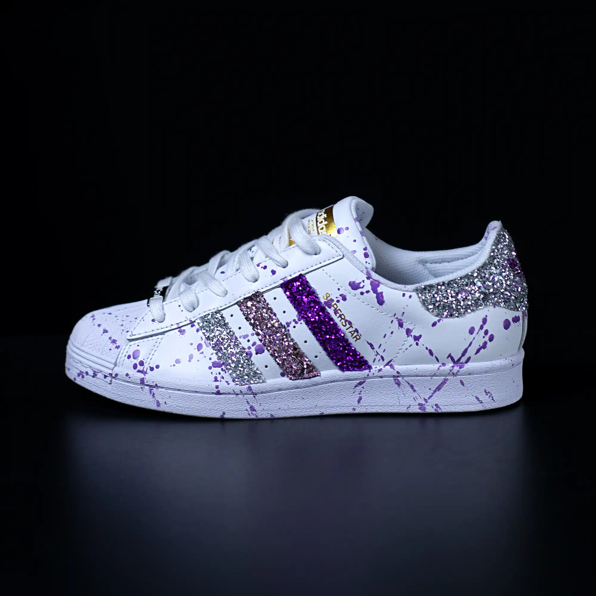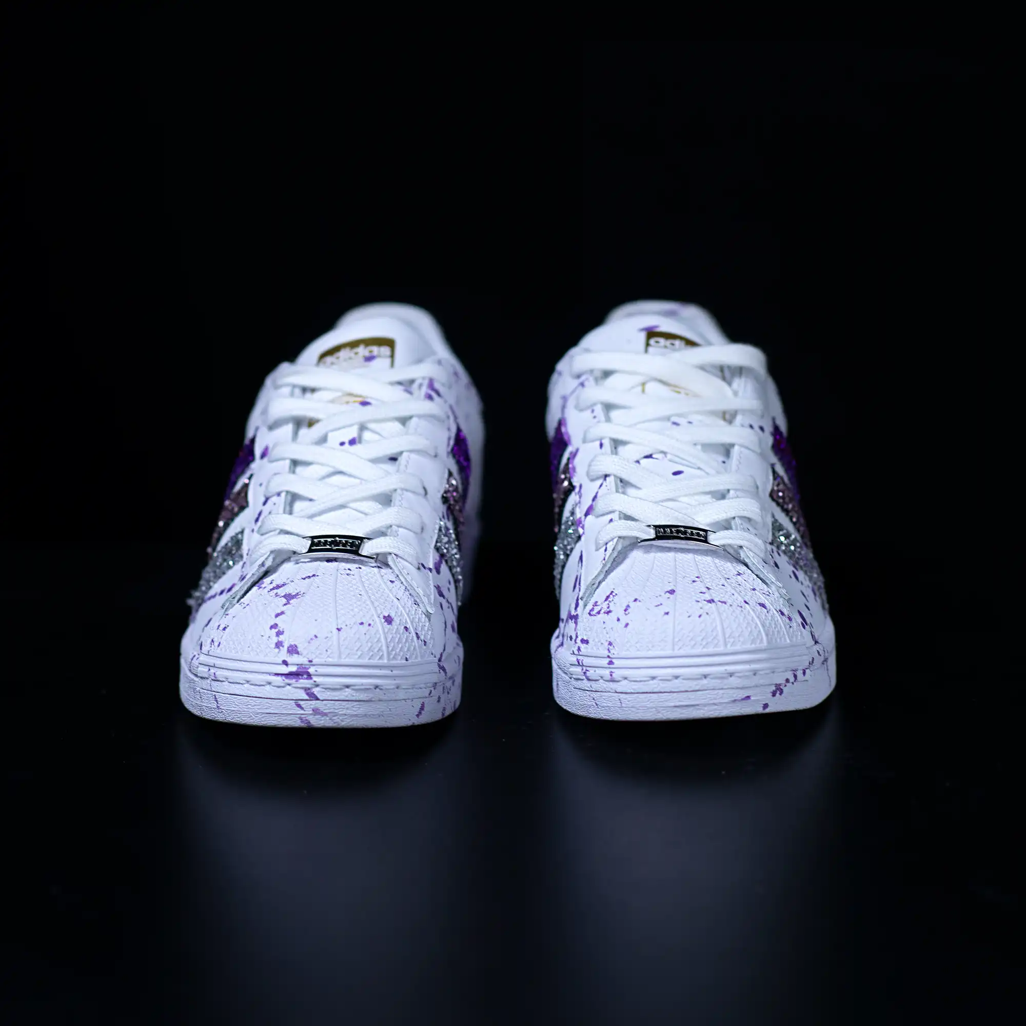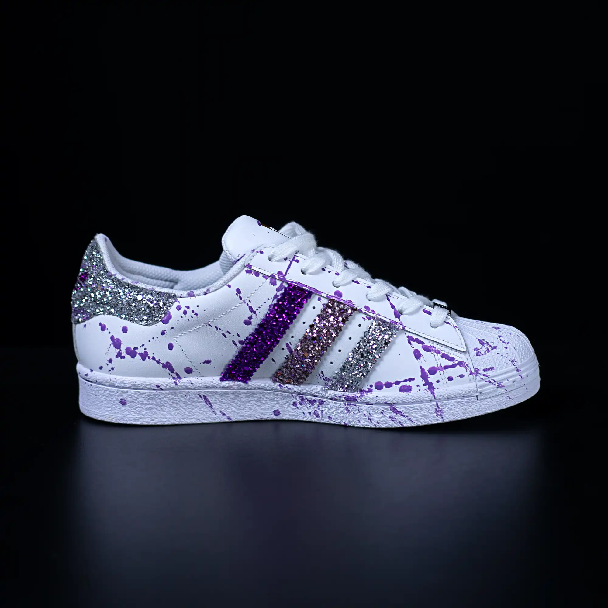 Queste Adidas Superstar Control sono personalizzate con glitter argento, viola, rosa antico, sporcatura pollock viola e logo viola sul tacco.