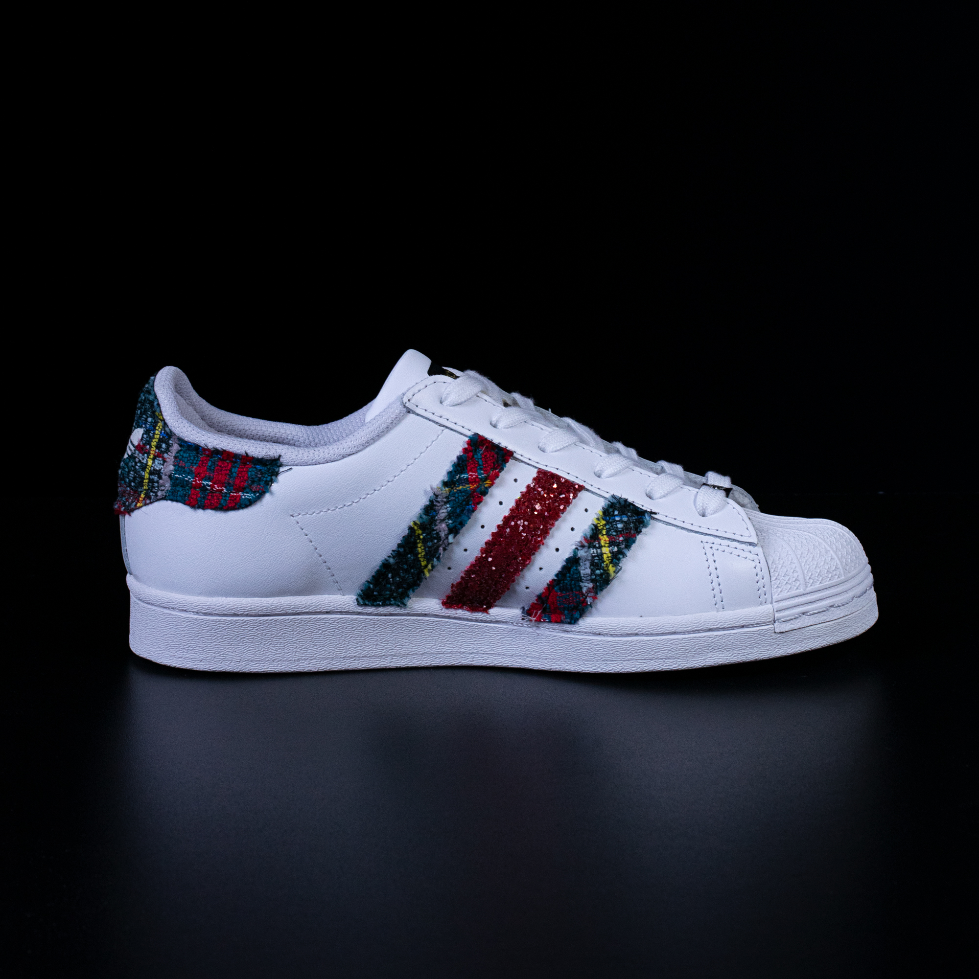 Queste Adidas Superstar Flowers sono personalizzate con tessuto paris verde, glitter rosso e logo glitter bianco sul tacco!