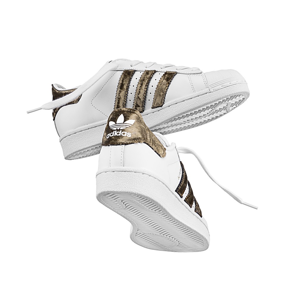 Queste Adidas Superstar Glue sono personalizzate con tessuto velluto oro e logo glitter bianco sul tacco!