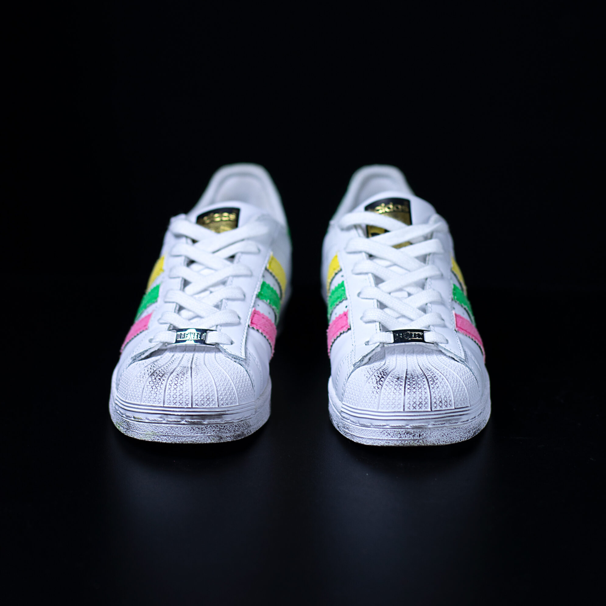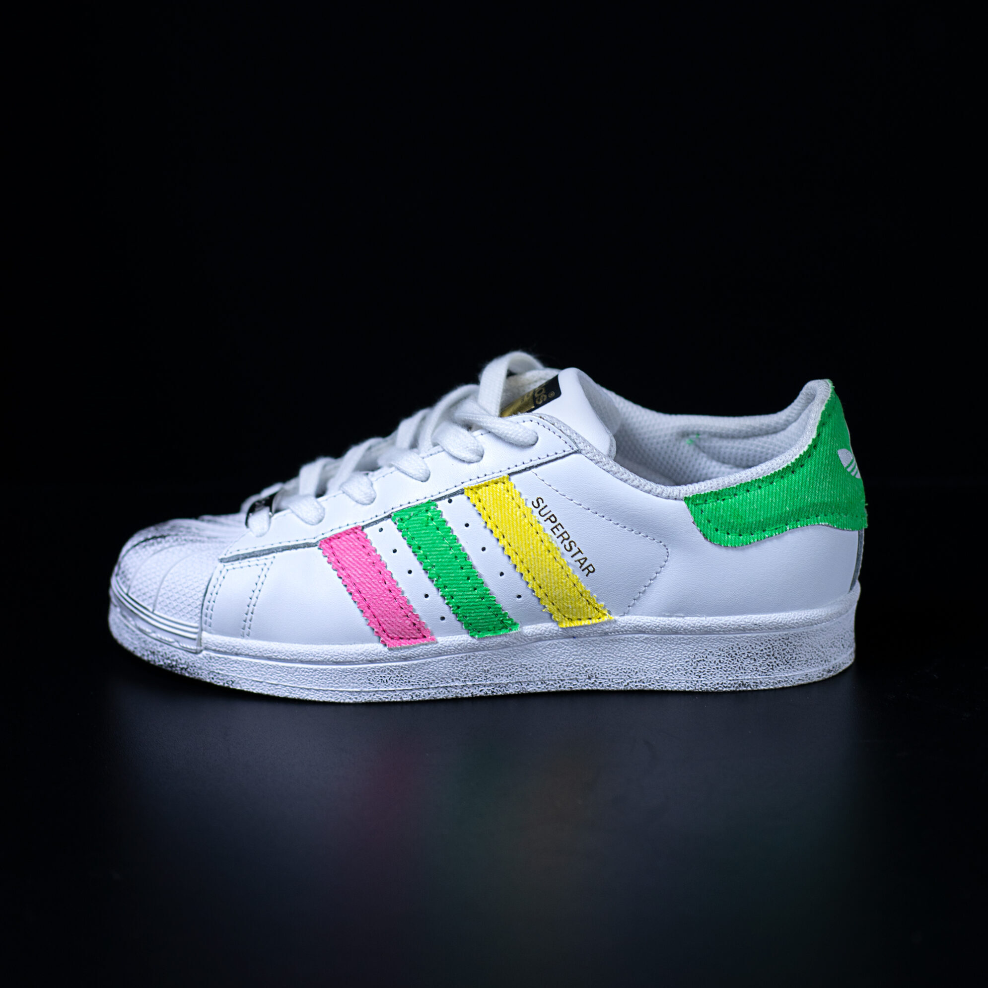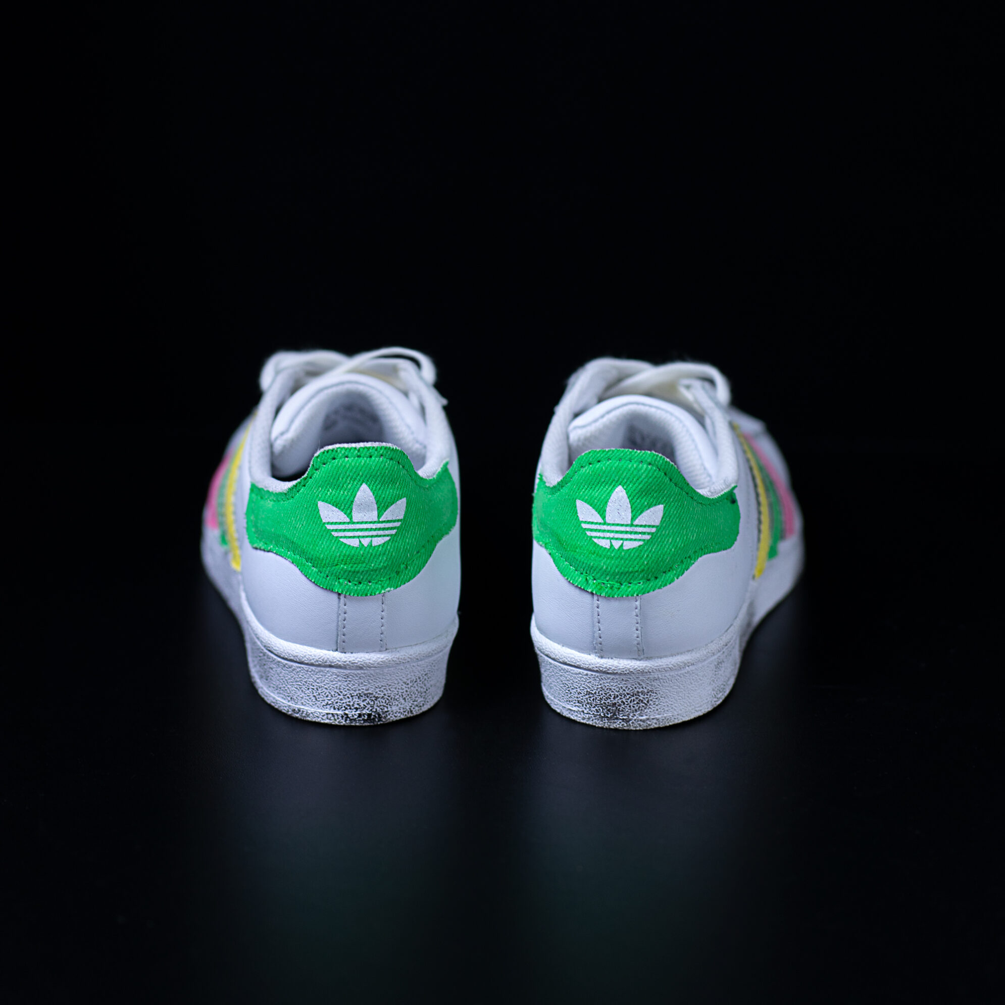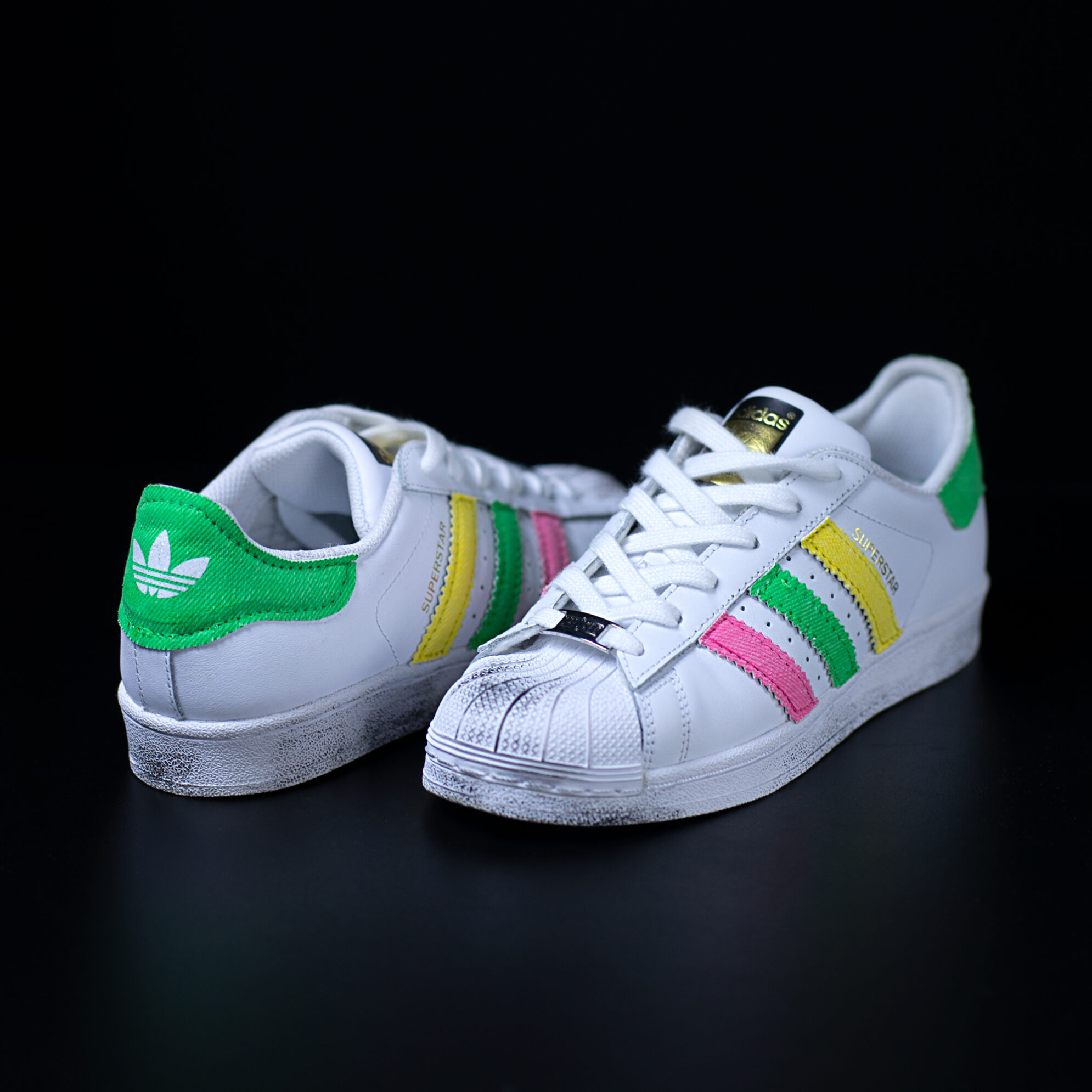 Queste Adidas Superstar Happy sono personalizzate con jeans verde, jeans giallo, jeans rosa sporcatura sulla suola e logo bianco glitter sul tacco!