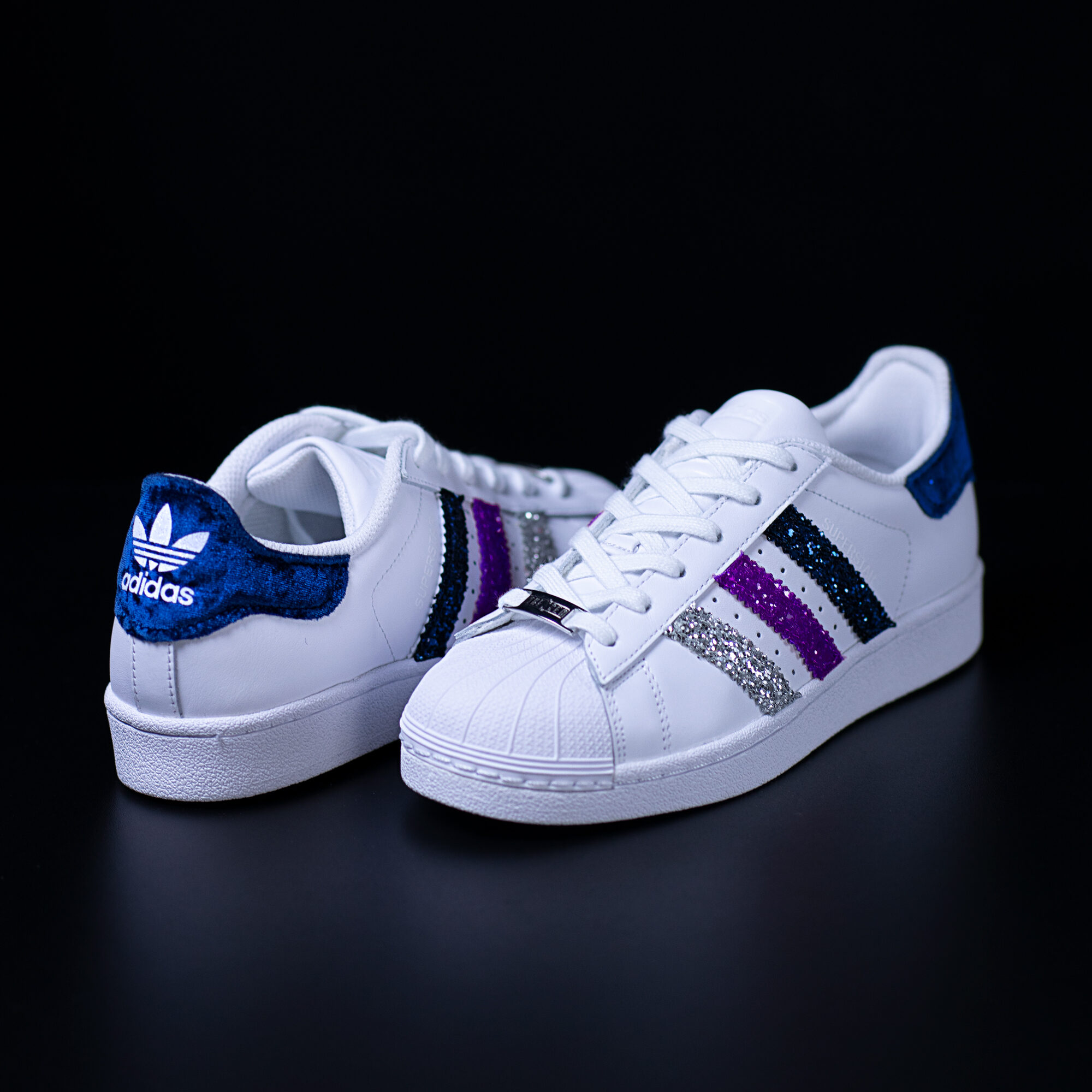 Queste Adidas Superstar Keeper sono personalizzate con velluto blu, glitter blu notte, glitter viola, glitter argento e logo bianco glitter sul tacco!