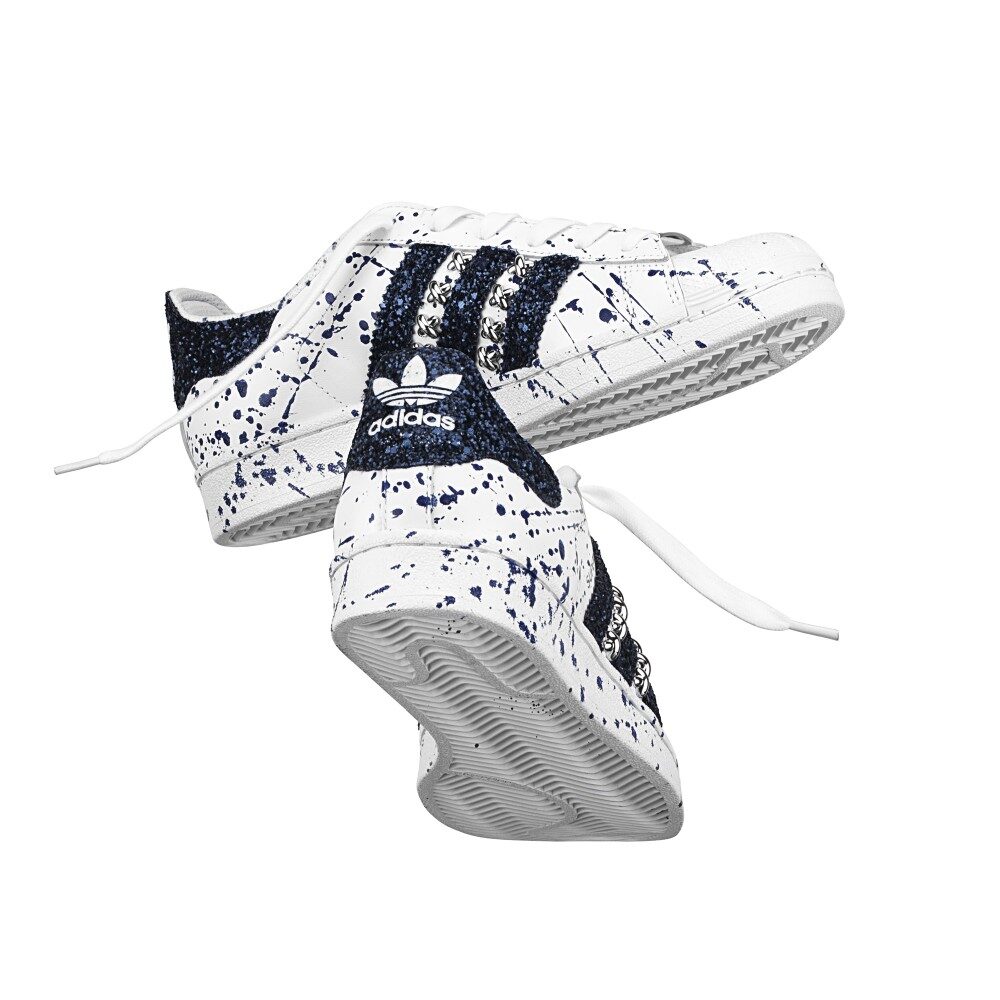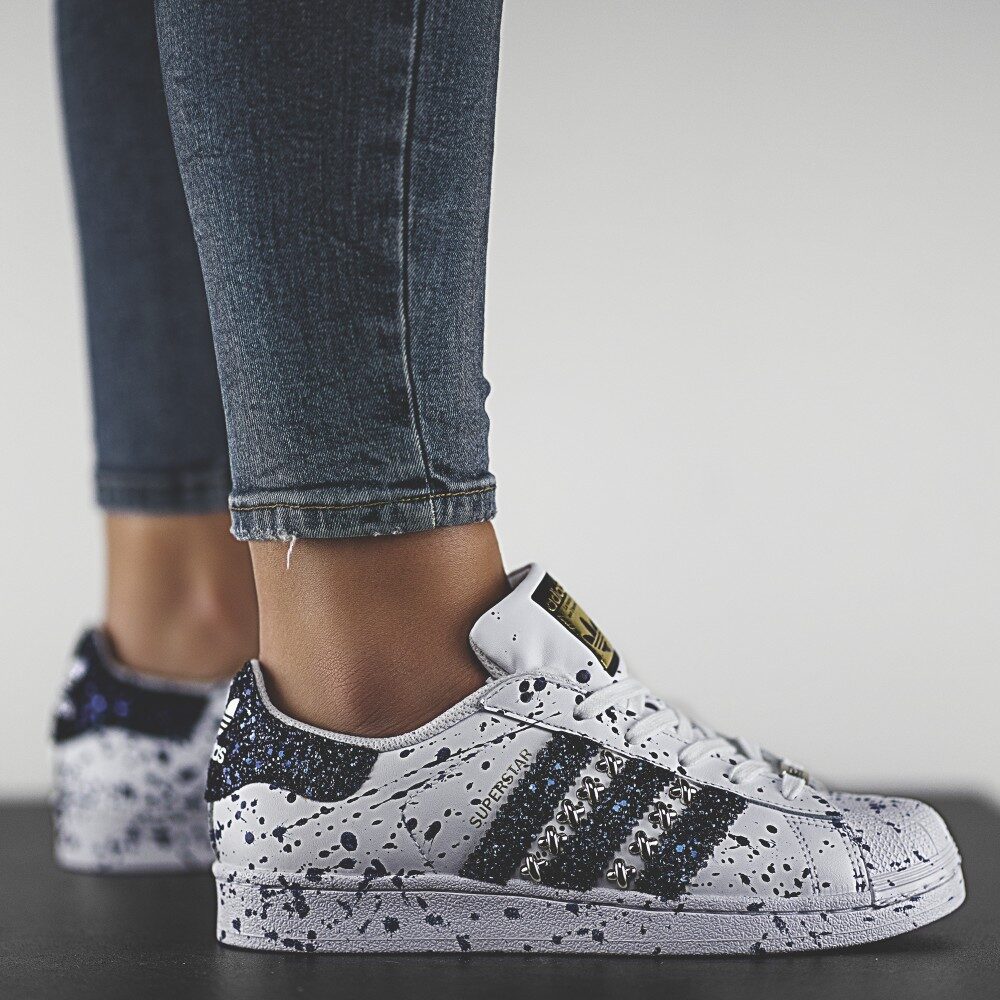 Queste Adidas Superstar La Javanaise sono personalizzate con glitter blu navy, borchie croce, sporcatura pollock blu e logo glitter bianco sul tacco!