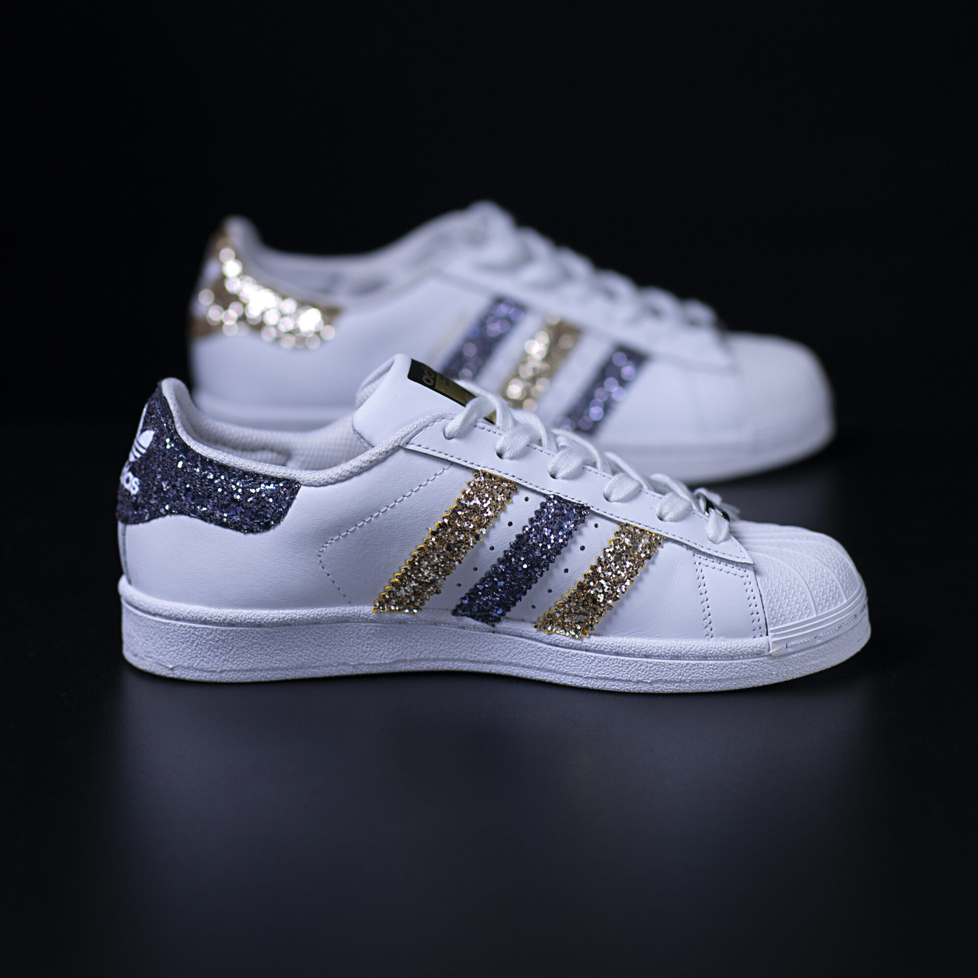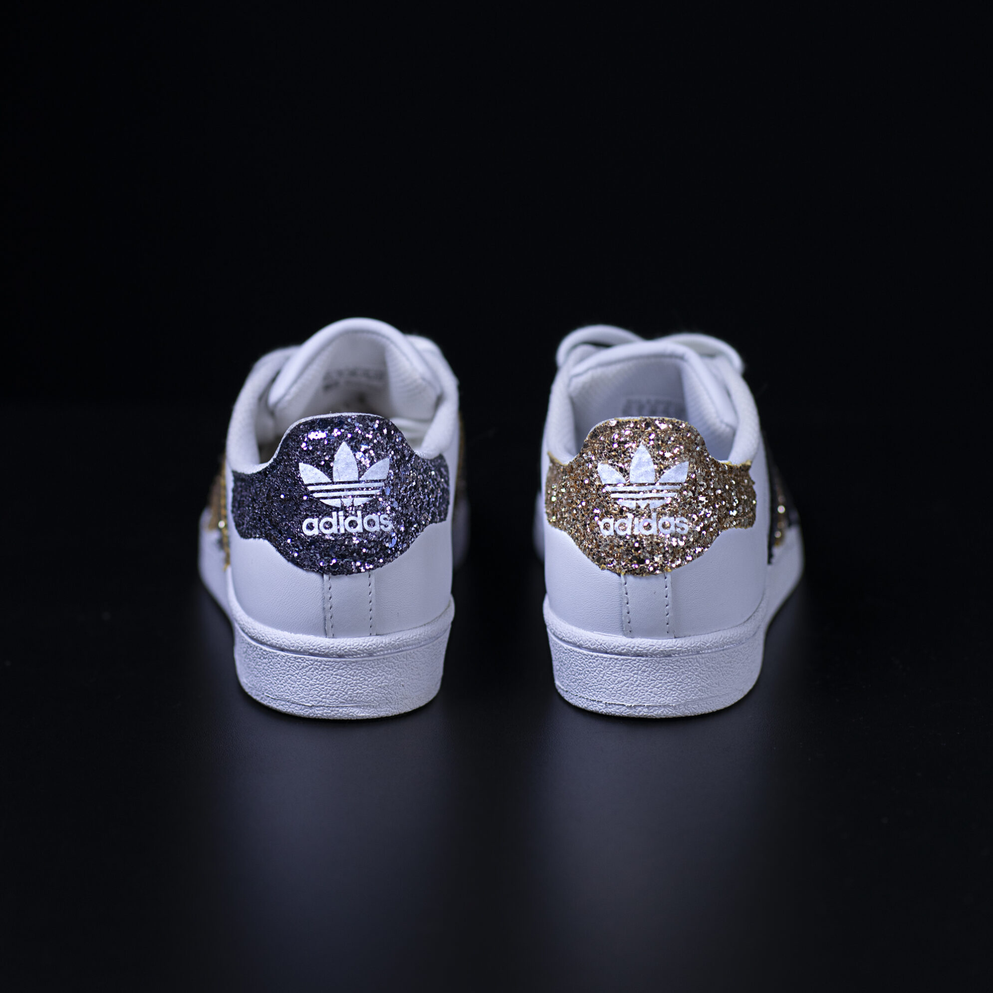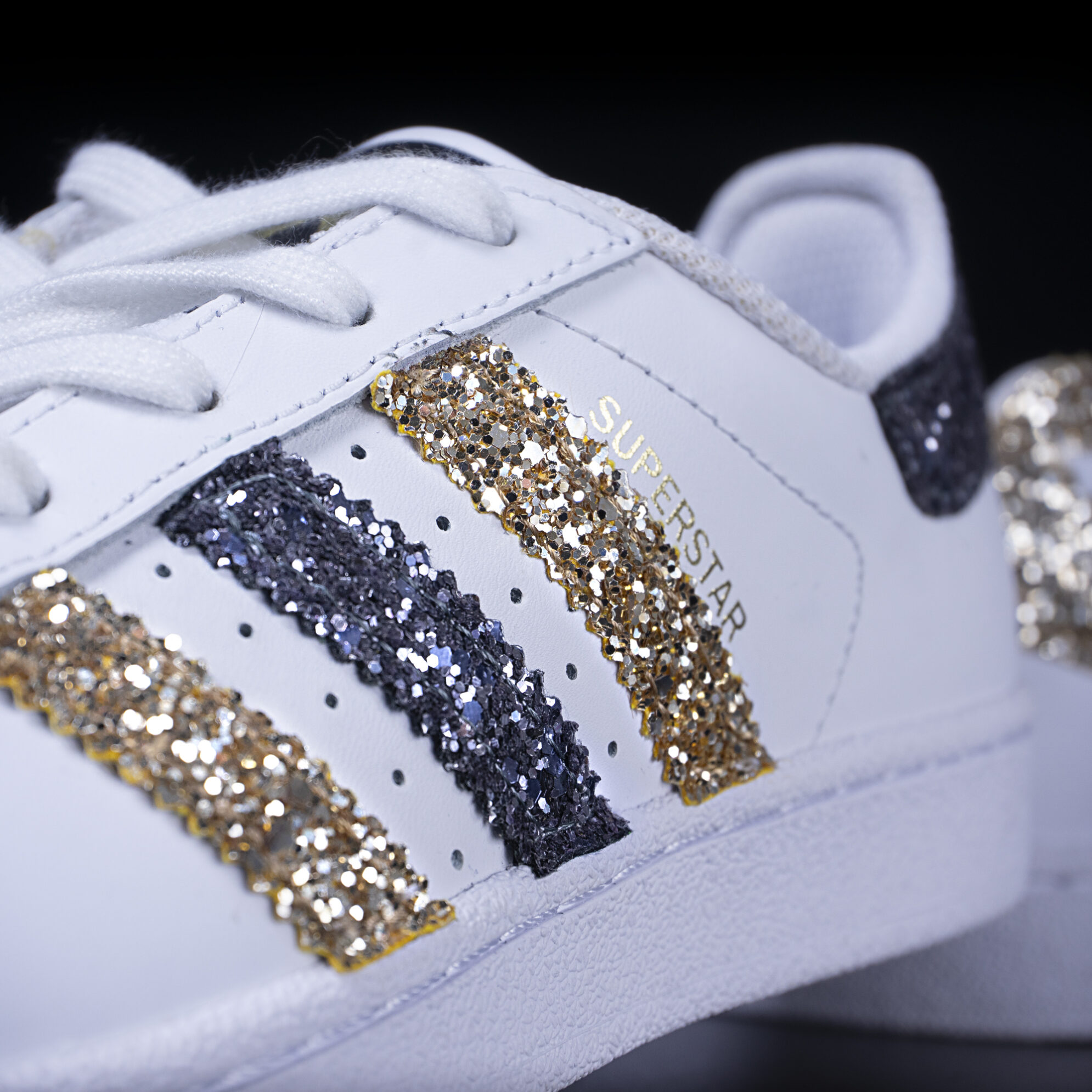 Queste Adidas Superstar OB sono personalizzate con glitter argento dark, glitter oro e logo bianco glitter sul tacco!