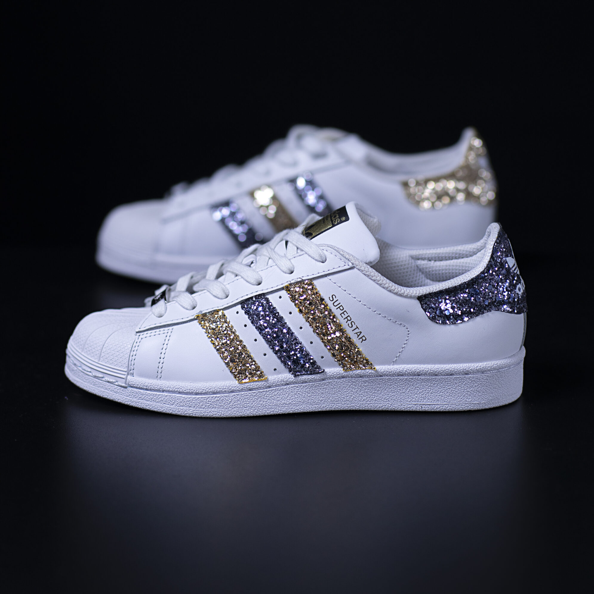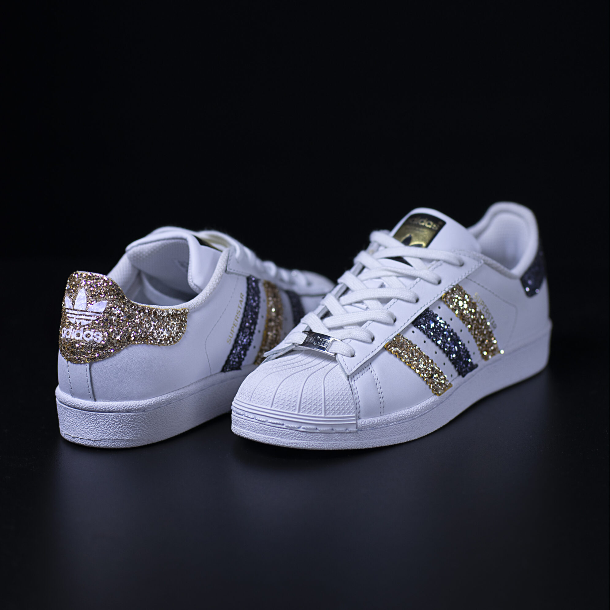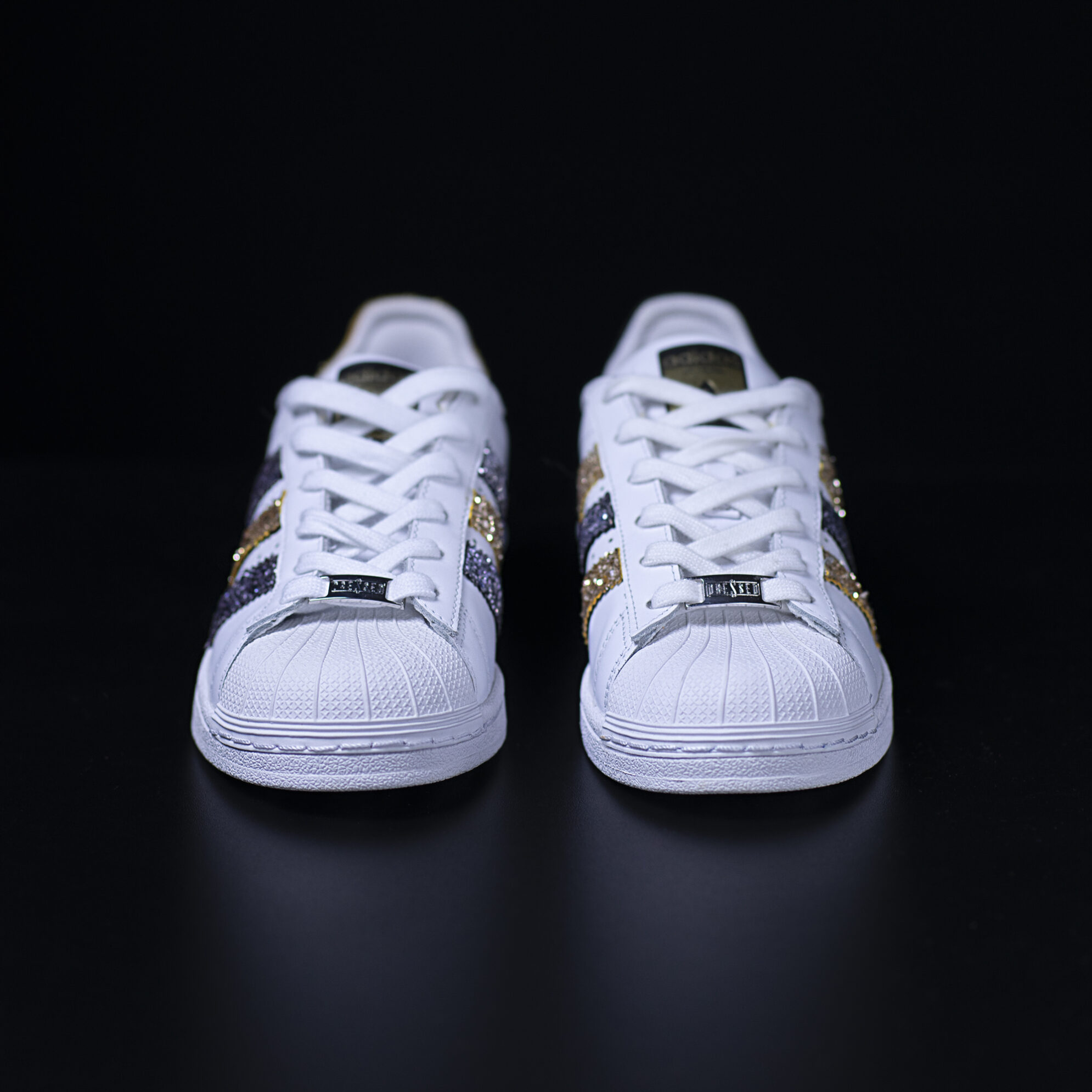 Queste Adidas Superstar OB sono personalizzate con glitter argento dark, glitter oro e logo bianco glitter sul tacco!