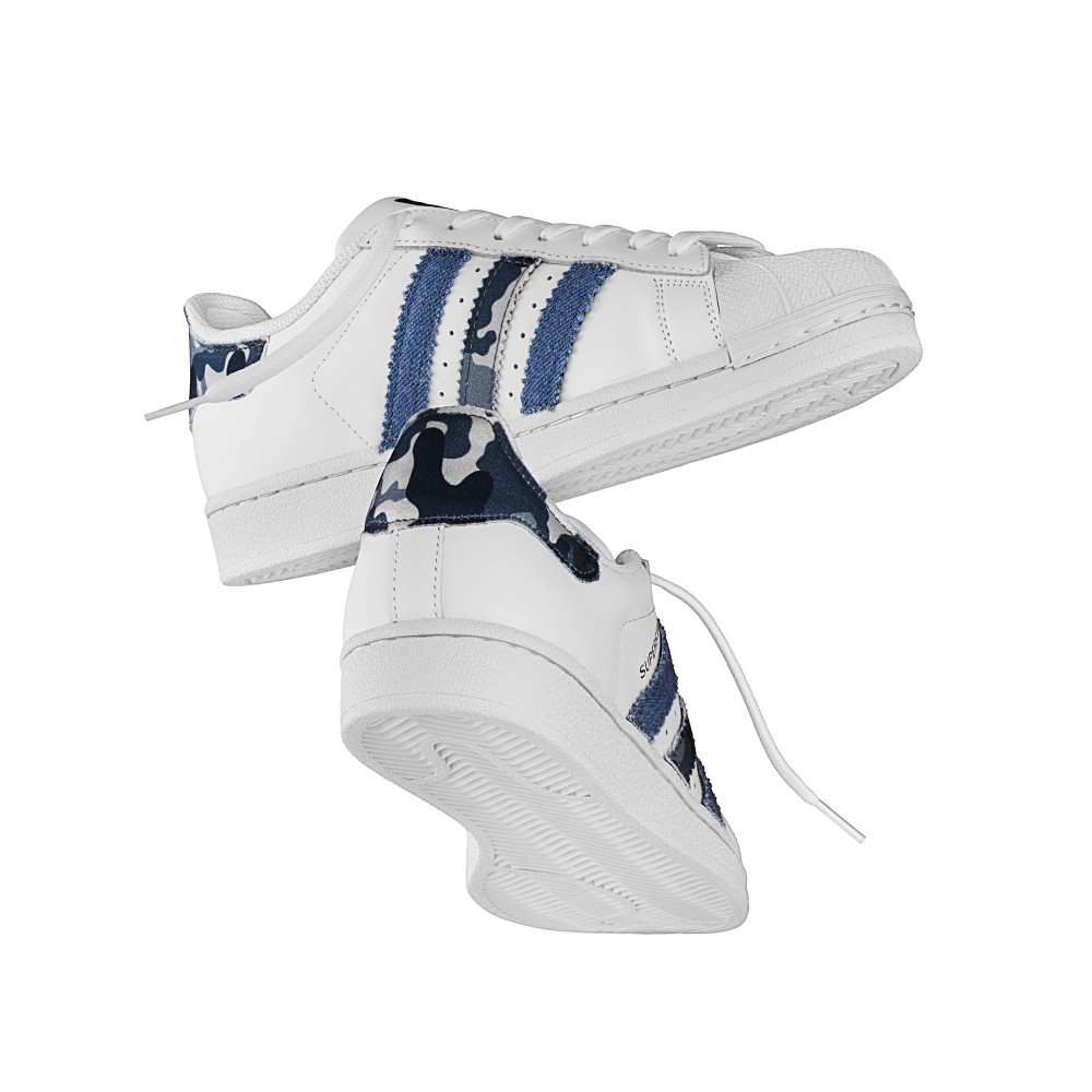 Queste Adidas Superstar Run to the Hills sono personalizzate con tessuto tessuto jeans e tessuto camouflage blu!