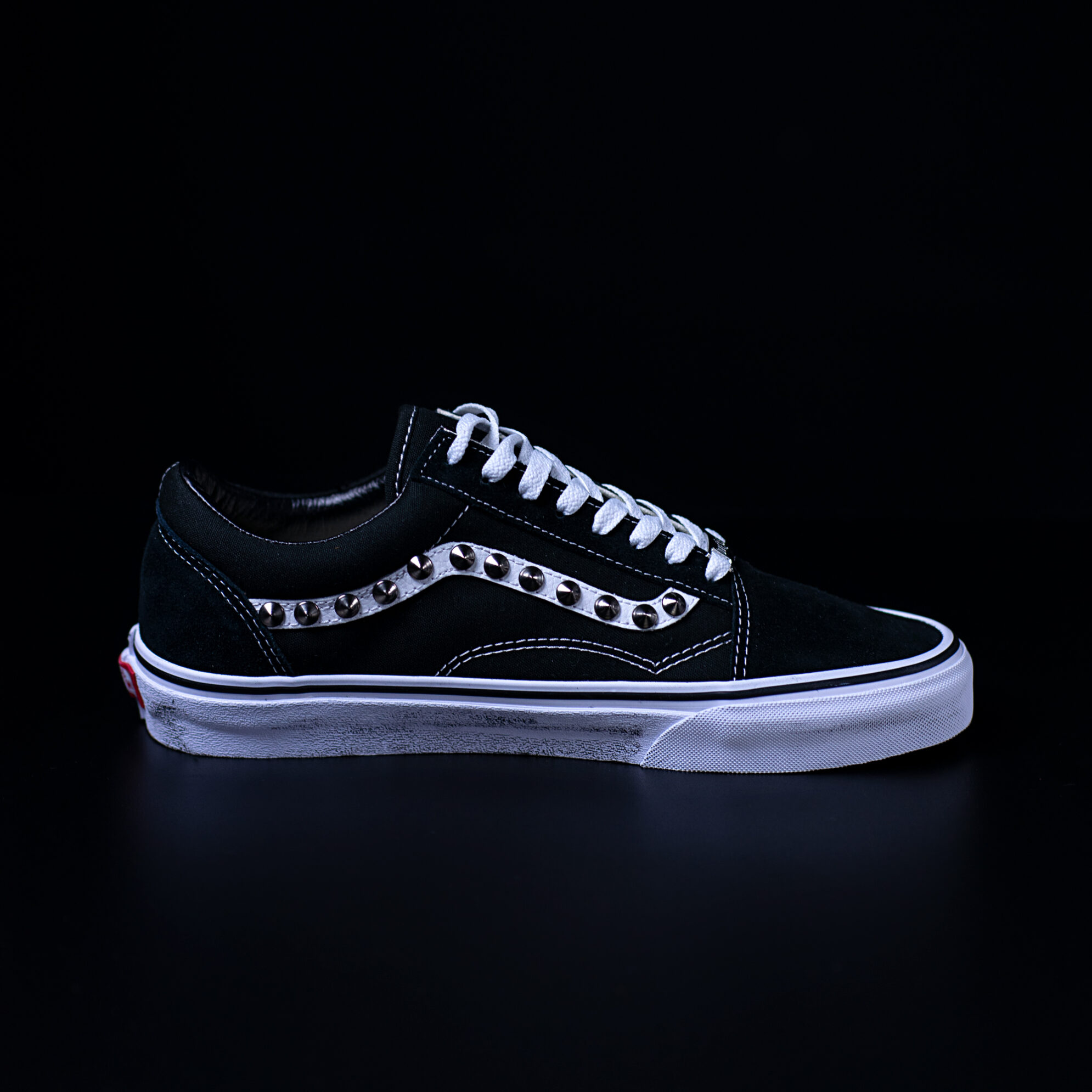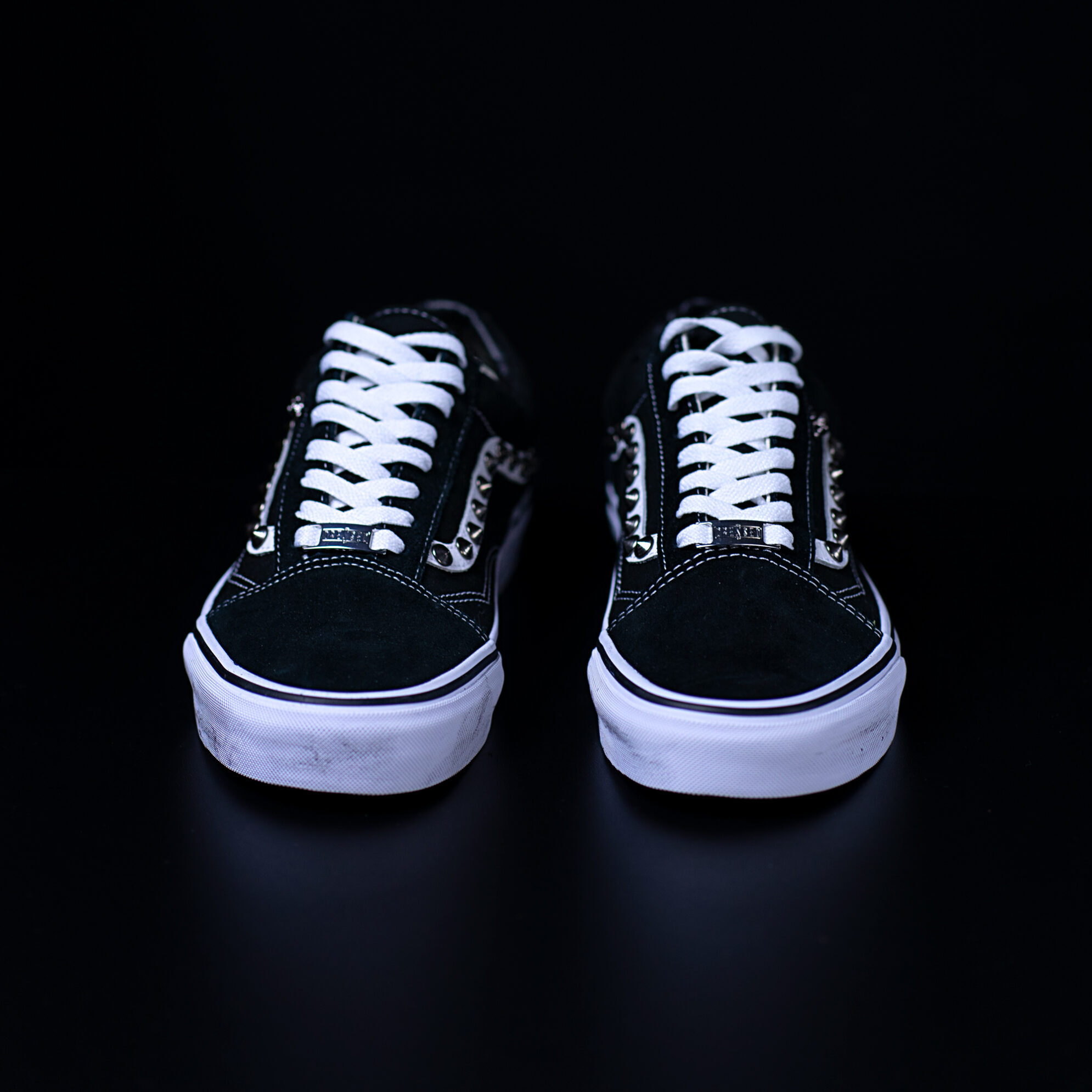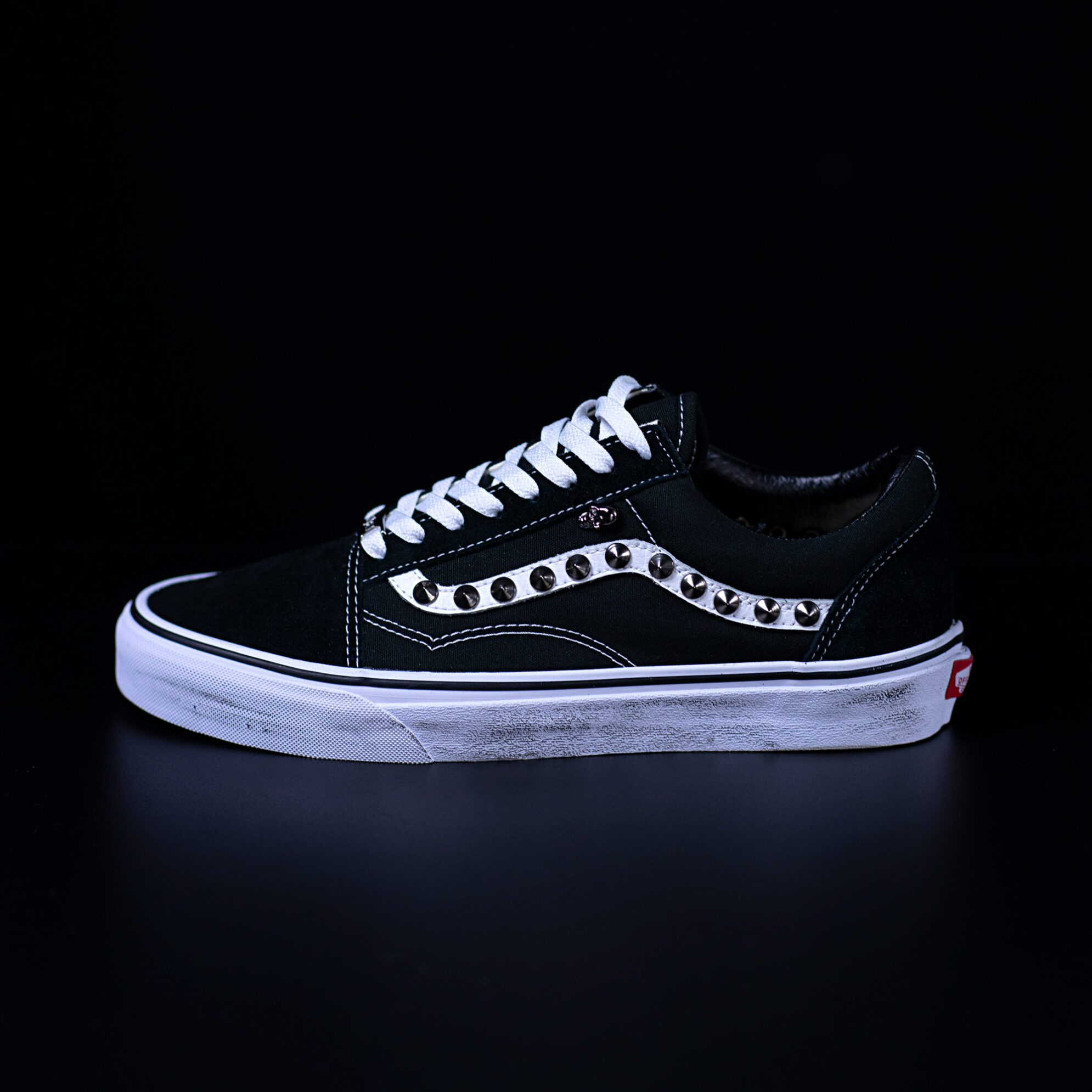 Queste Vans Old Skool Don’t Start Now sono personalizzate con borchie canna di fucile, borchie teschio canna di fucile e sporcatura sulla suola.